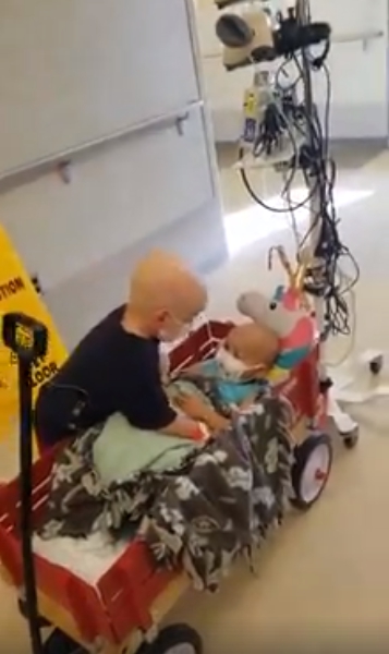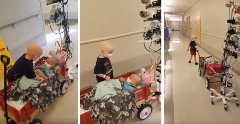 Ambos tienen una mascarilla que cubre su rostro y vías en sus venas para recibir el tratamiento contra su enfermedad. El niño demuestra cuánto amor hay en su enorme corazón, a pesar de que él también está padeciendo los síntomas del cáncer se dedica a brindare un momento agradable a su amiga que no puede caminar.