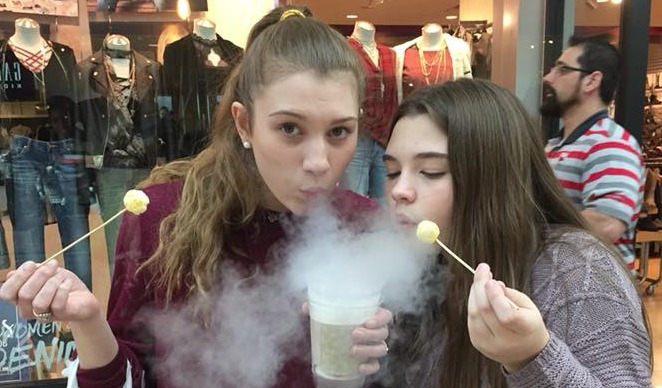 El refrigerio colorido está cubierto de nitrógeno líquido y hace que salga humo de la nariz y la boca de una persona después de comerlo.