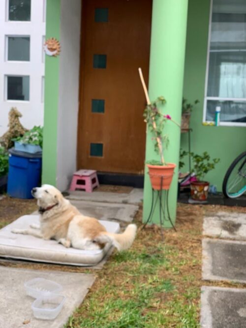 «Él tiene una camita en un edificio de aquí donde vivo, aunque no se ha dejado domesticar, sí tiene un techo donde dormir caliente y sin pasar frío o estar bajo la lluvia. Además, no solo duerme en el edificio, también tiene un colchón en una casa atrás de la farmacia, conmigo no se queda ni en la farmacia, ya que estar encerrado a él lo estresa y se pone mal, es real, pero él duerme en un techo toda la noche».